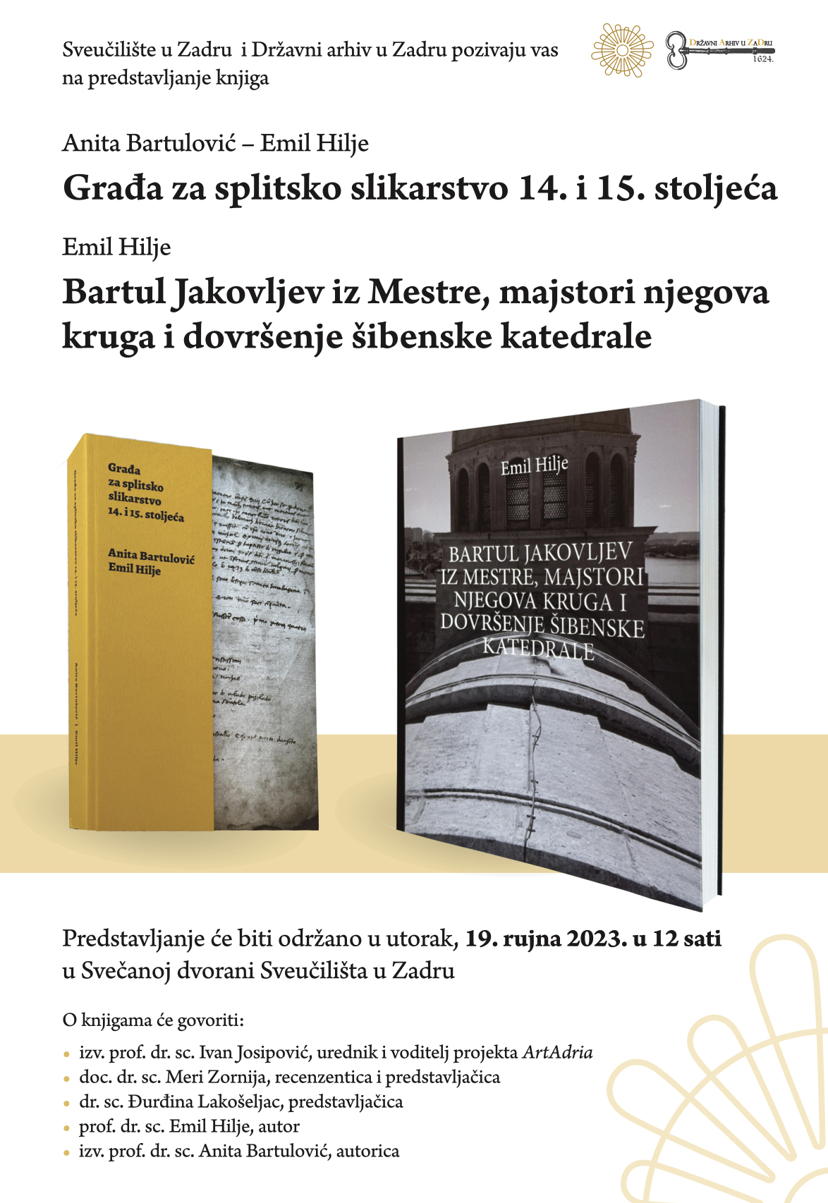 Sveučilište u Zadru i Državni arhiv u Zadru pozivaju vas na predstavljanje knjiga Građa za splitsko slikarstvo 14. i 15. stoljeća autora Anite Bartulović i Emila Hilje te Bartul Jakovljev iz Mestre, majstori njegova kruga i dovršenje šibenske katedrale autora Emila Hilje.