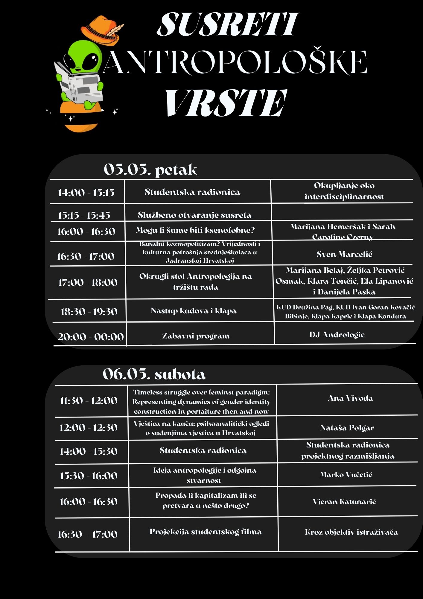 Projekt „Susreti antropološke vrste“ organiziraju studenti Sveučilišta u Zadru od 5. do 6. svibnja. Riječ je o kulturno-znanstvenom projektu koji za cilj ima promicanje znanosti uz suradnju, umrežavanje i druženje studenata.