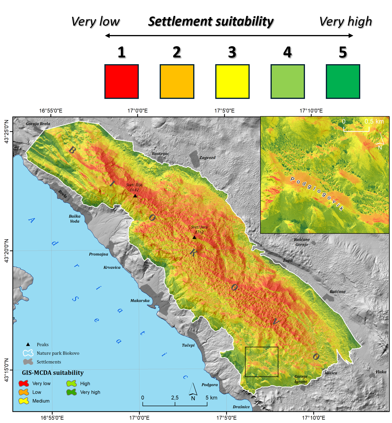 Key findings reveal that over 75% of Biokovo's terrain is unsuitable for settlement due to steep relief and harsh climatic conditions, while approximately 6% was classified as highly suitable. The analysis demonstrated a high degree of accuracy, with historical settlements aligning closely with the identified optimal areas.